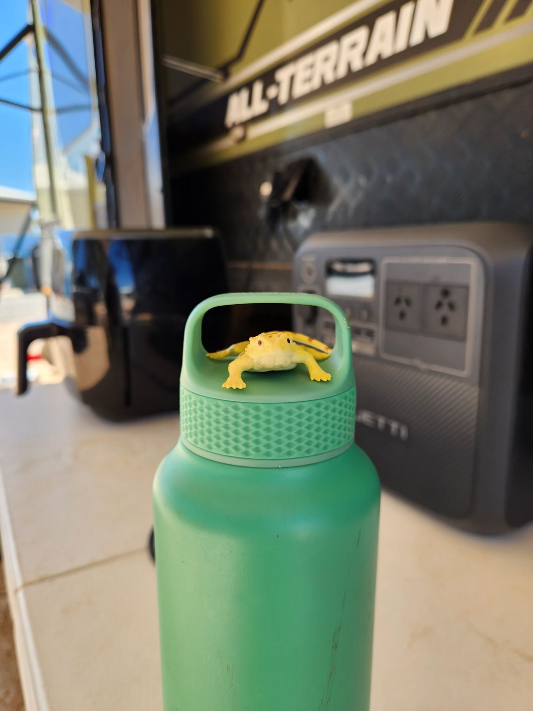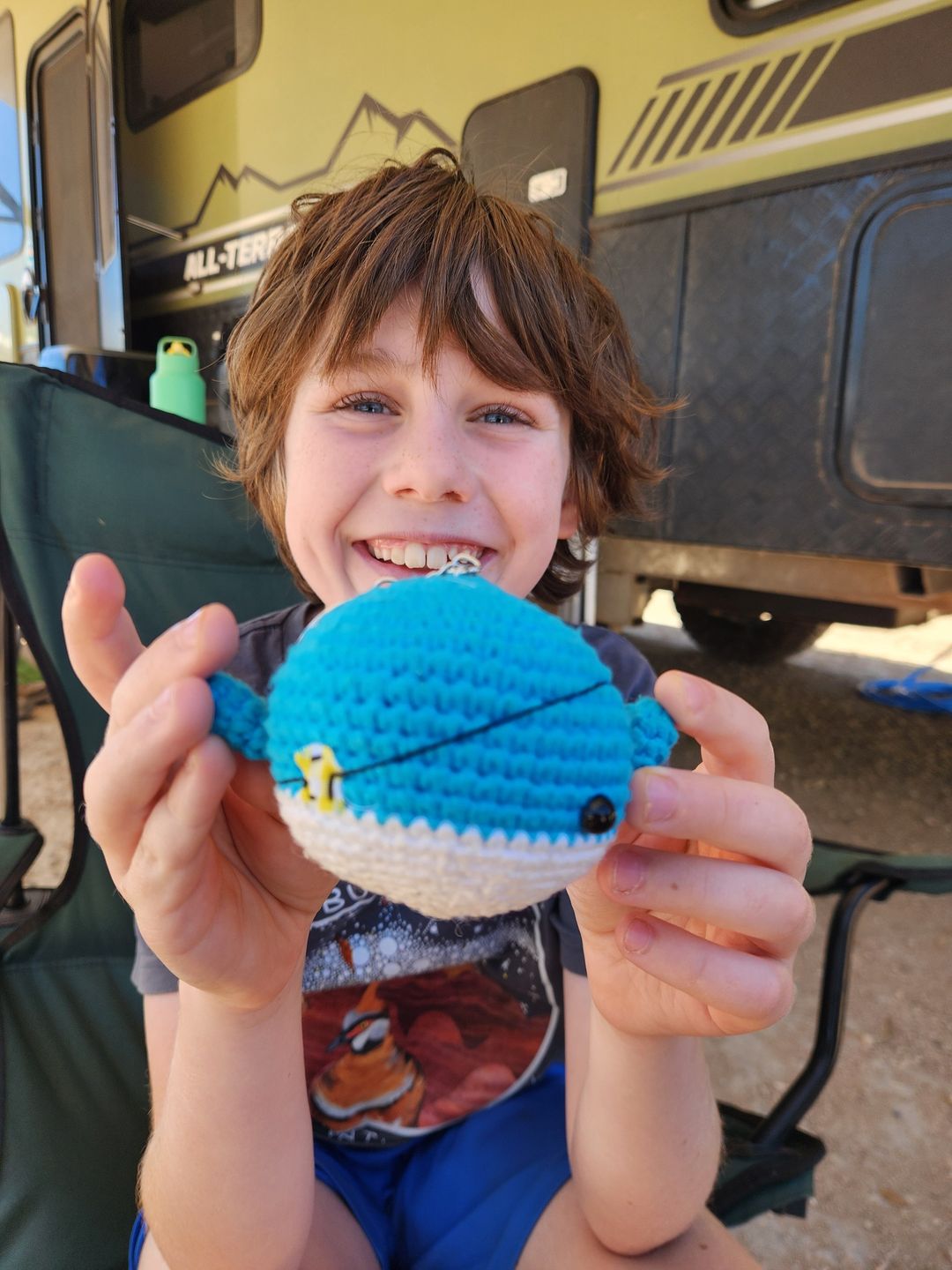 While setting up camp Theo discovered that Waffle (the crochet whale) had lost