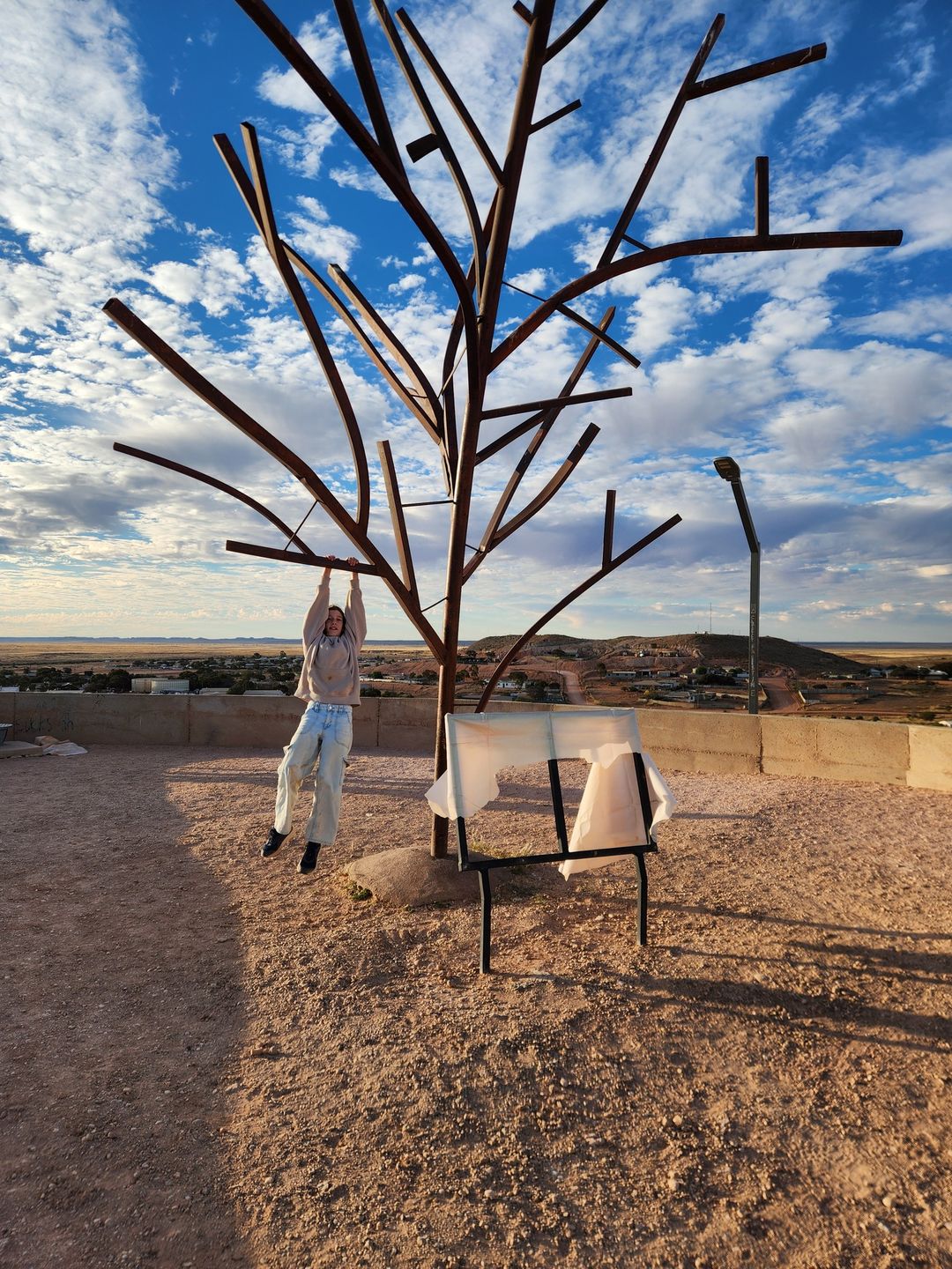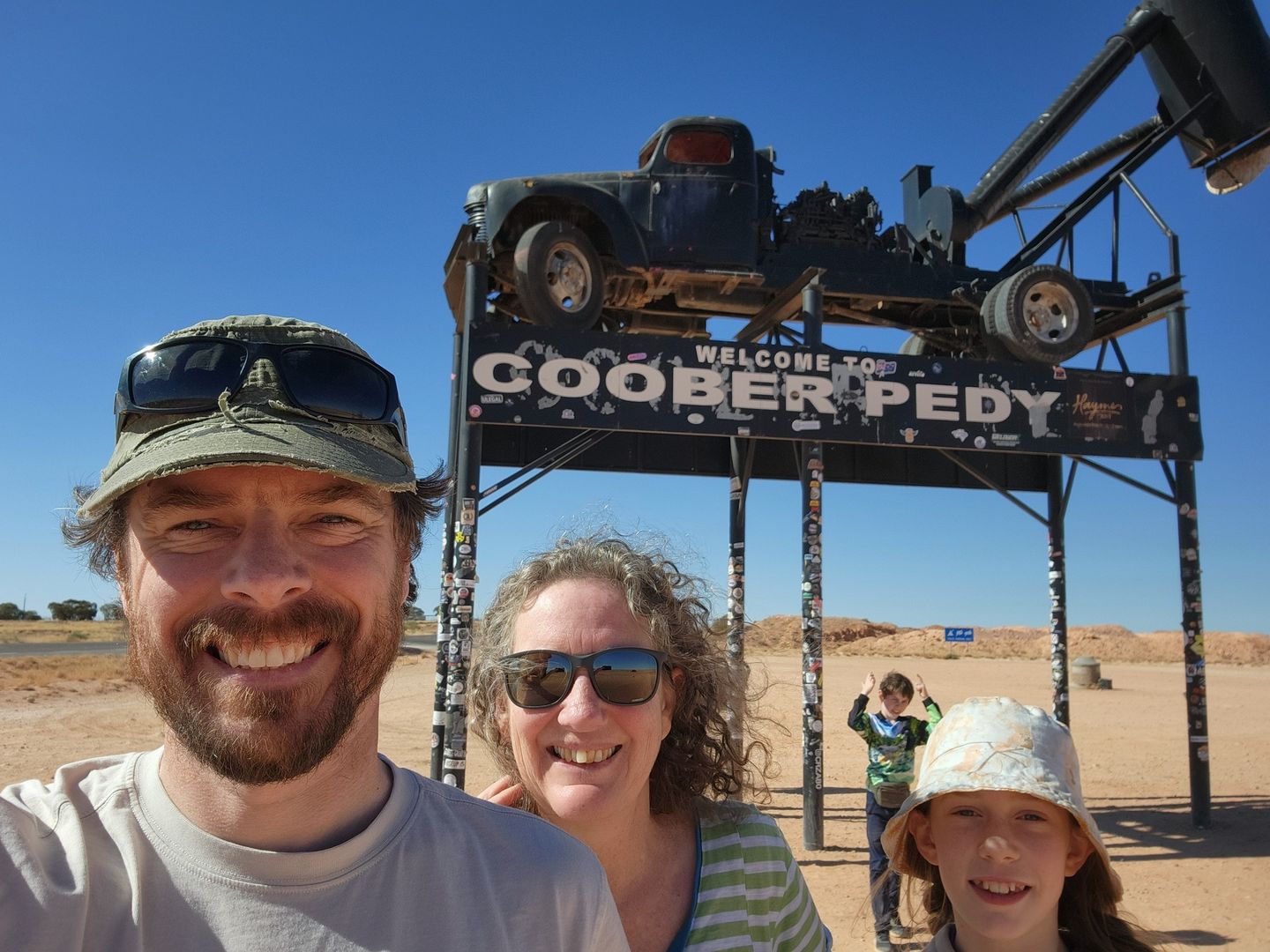 Today we drove from William Creek to Coober Pedy. In Coober Pedy there was a metal tree, a tree with lots of helmets, and a big winch. We camped in the carpark of the Old Timers Mine. For dinner we went to Dad's Pizza bar.